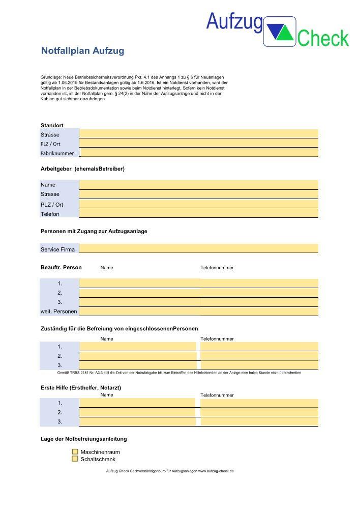 Für jede Aufzugsanlage mit Personenbeförderung ist gemäß Anhang I BetrSichV ein orts- und anlagenspezifischer Notfallplan anzufertigen und dem Notdienst/Notbefreier zur Verfügung zu stellen.